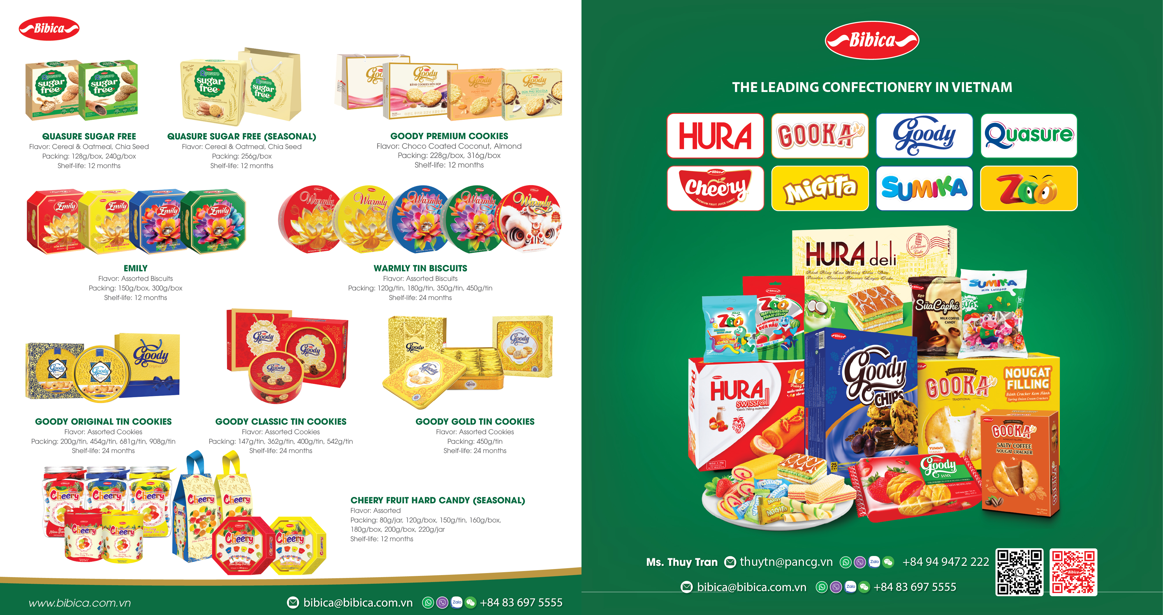 Bibica is one of Vietnam’s leading confectionery manufacturers, specializing in high-quality biscuits, cookies, cakes, crackers, and candies. Equipped with state-of-the-art production facilities, Bibica has established itself as a reliable and reputable supplier in both domestic and international markets. The company is strongly committed to product innovation, consistently delivering high-quality and delightful products to consumers worldwide. Its flagship brands include HURA, GOOKA, GOODY, QUASURE, MIGITA, SUMIKA, ZOO, and are widely recognized for their superior taste and quality.